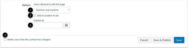 ✏️Note: You can decide who can edit the page by clicking the “Users allowed to edit this page” drop-down menu. Options include only teachers, teachers and students, or anyone. The Anyone option only applies to users who are enrolled in the course.