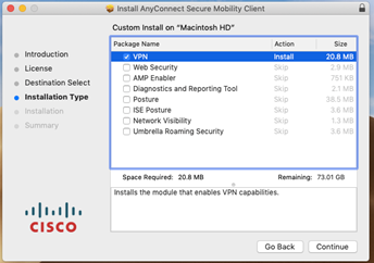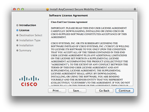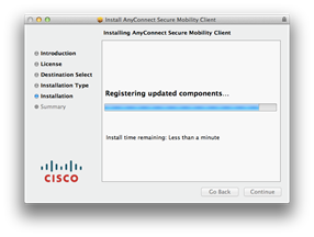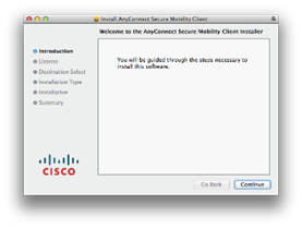 - On the following screen titled Welcome to the AnyConnect Secure Mobility Client Installer, click Continue.