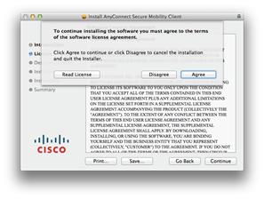 - When presented with the software license agreement, click Continue then click Agree on the slide-down menu.