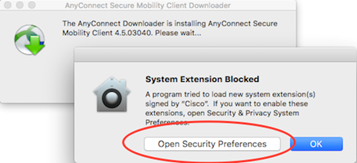 - During the upgrade process, you will get a System Extension Blocked pop-up message. Click on Open Security Preferences.