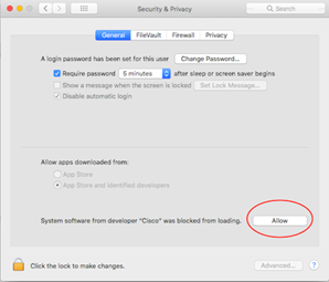 This will open the Security & Privacy window. At the bottom, you will see the "System software from developer Cisco was blocked from loading" message. Click on "Allow."